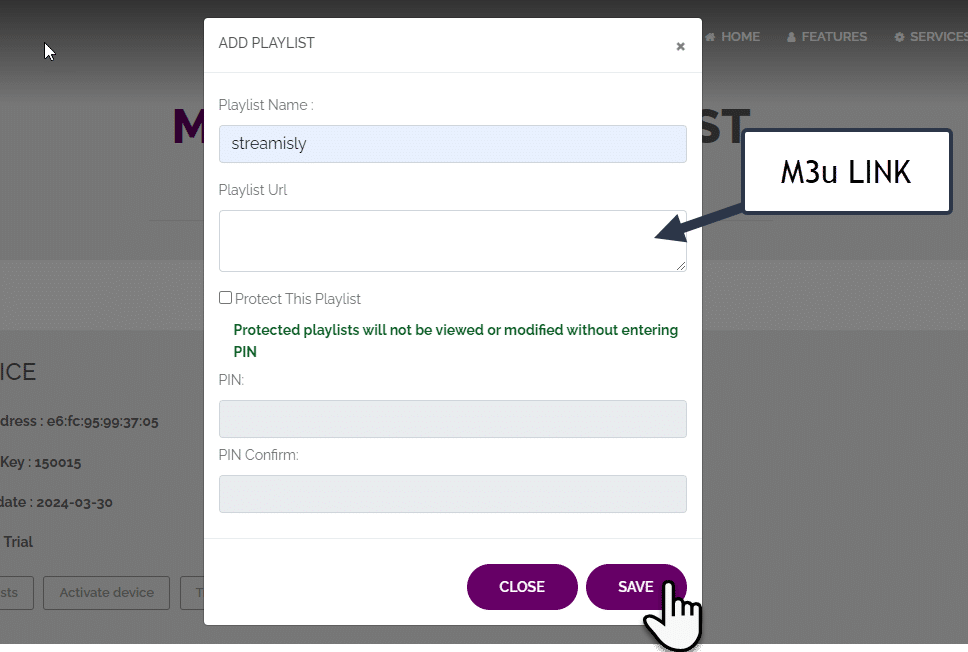 - Klicken Sie auf „Add Playlist“, fügen Sie Ihren von Hakuna TV bereitgestellten M3U-Link ein und klicken Sie anschließend auf „Save“.