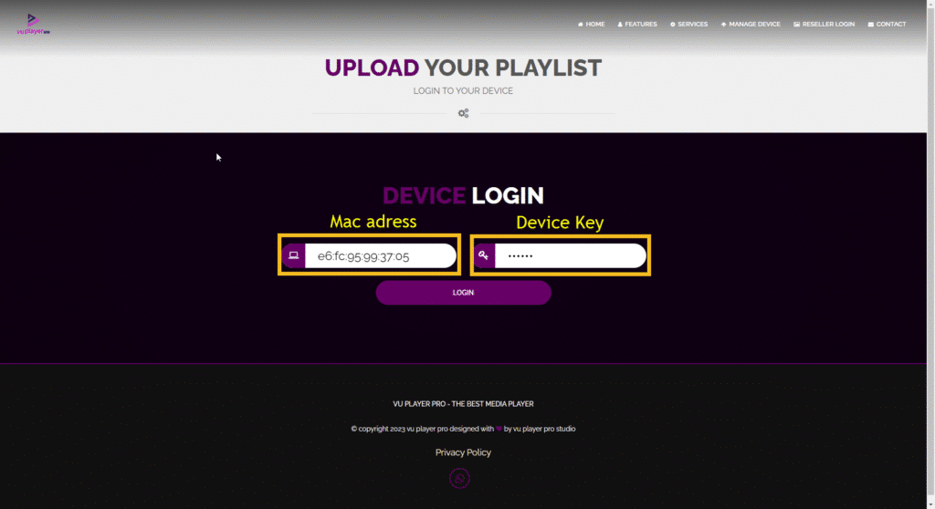 Gehen Sie auf https://vuplayer.pro/login und geben Sie die MAC-Adresse sowie den Geräte-Schlüssel ein.