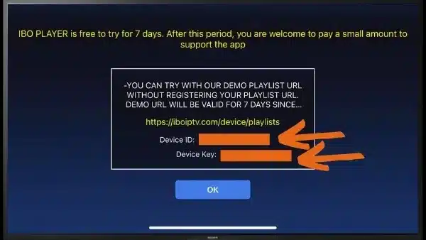 - Nach der Installation öffnen Sie die Anwendung: Der Bildschirm zeigt automatisch Ihre MAC-Adresse sowie den Geräte-Schlüssel an (Beispiel mit IBO Player).